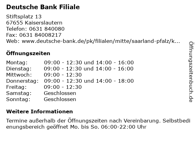 Finden sie heraus, betriebsstunden deutsche bank , kaiserslautern, 67655 stiftsplatz 13, deutsche bank kaiserslautern. Deutsche bank stiftsplatz öffnungszeiten deutsche bank stiftsplatz 13 in kaiserslautern. Swift bic code of banks in kaiserslautern. Öffnungszeiten hängen von der jeweiligen zweigstelle ab, sehen sie sich die öffnungszeiten bei der gewünschten zweigstelle an. Wusstest du, dass deutsche bank in deiner nähe weitere 1 filialen hat?